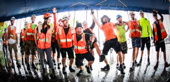 在搭建现场的几十名技术人员,将地面上的100多根金属柱子分四次一同手动撑起,瞬间“黄蓝相间的城堡”一跃而起。据悉,每根金属柱子重达50-60kg,需要工人们一同喊口号并由3-4位工人协作撑起,现场气势非常壮观。值得一提的是,太阳马戏的帐篷安全性能非常良好,其篷布材料为燃点较低的乙烯基,即使在天气恶劣的情况下也完全可以保证帐篷内的温度及稳固性。